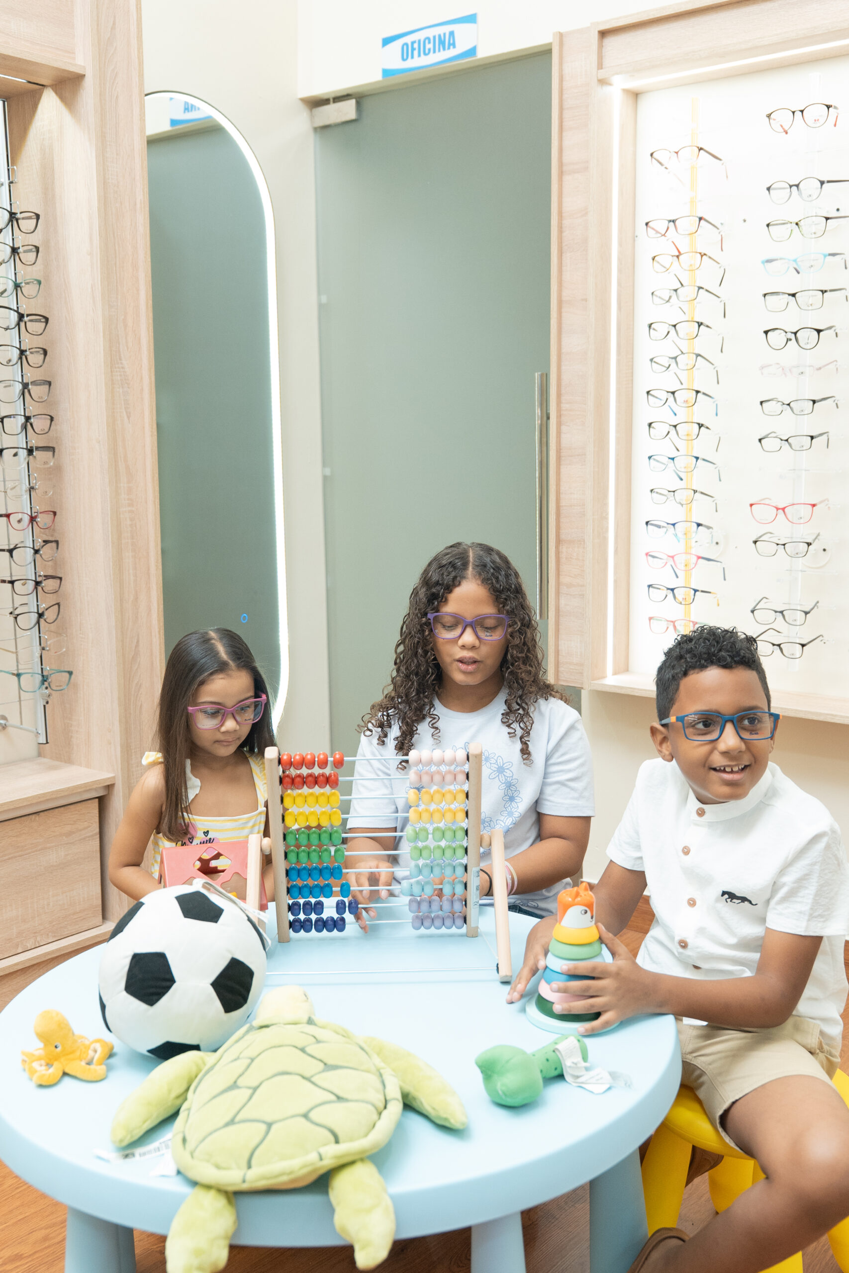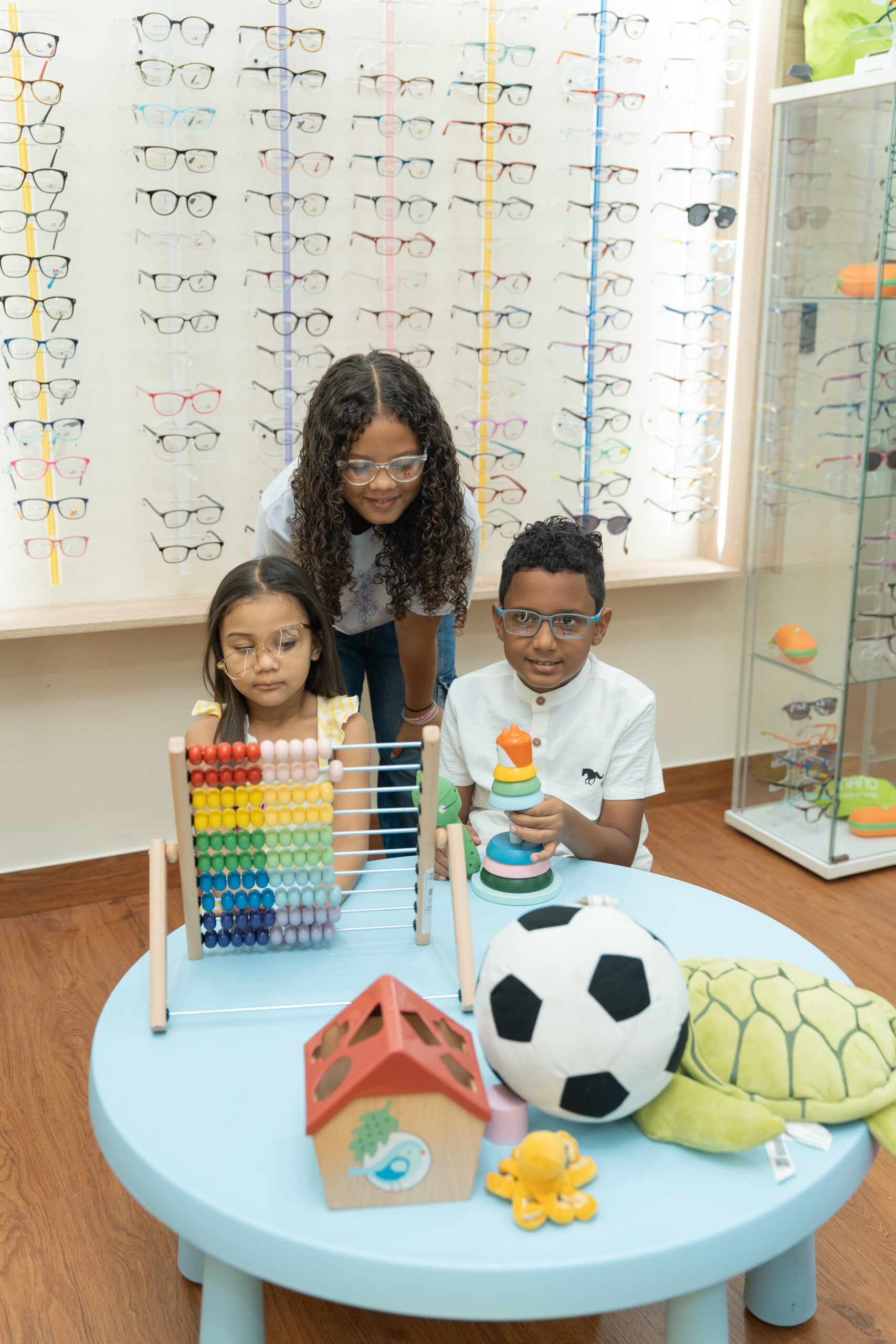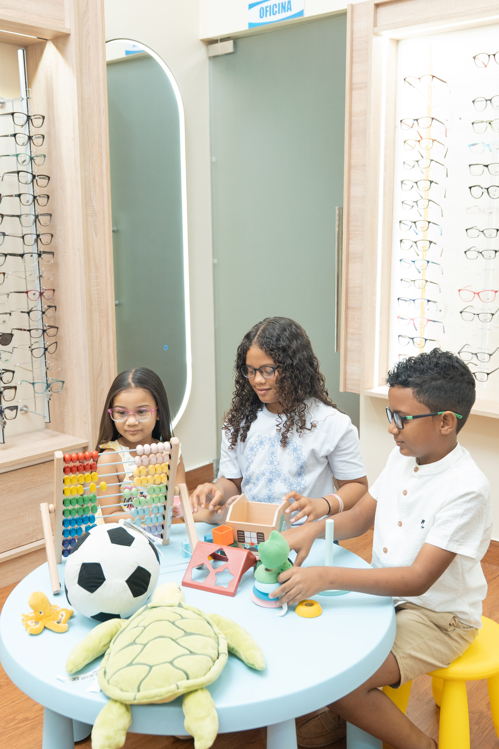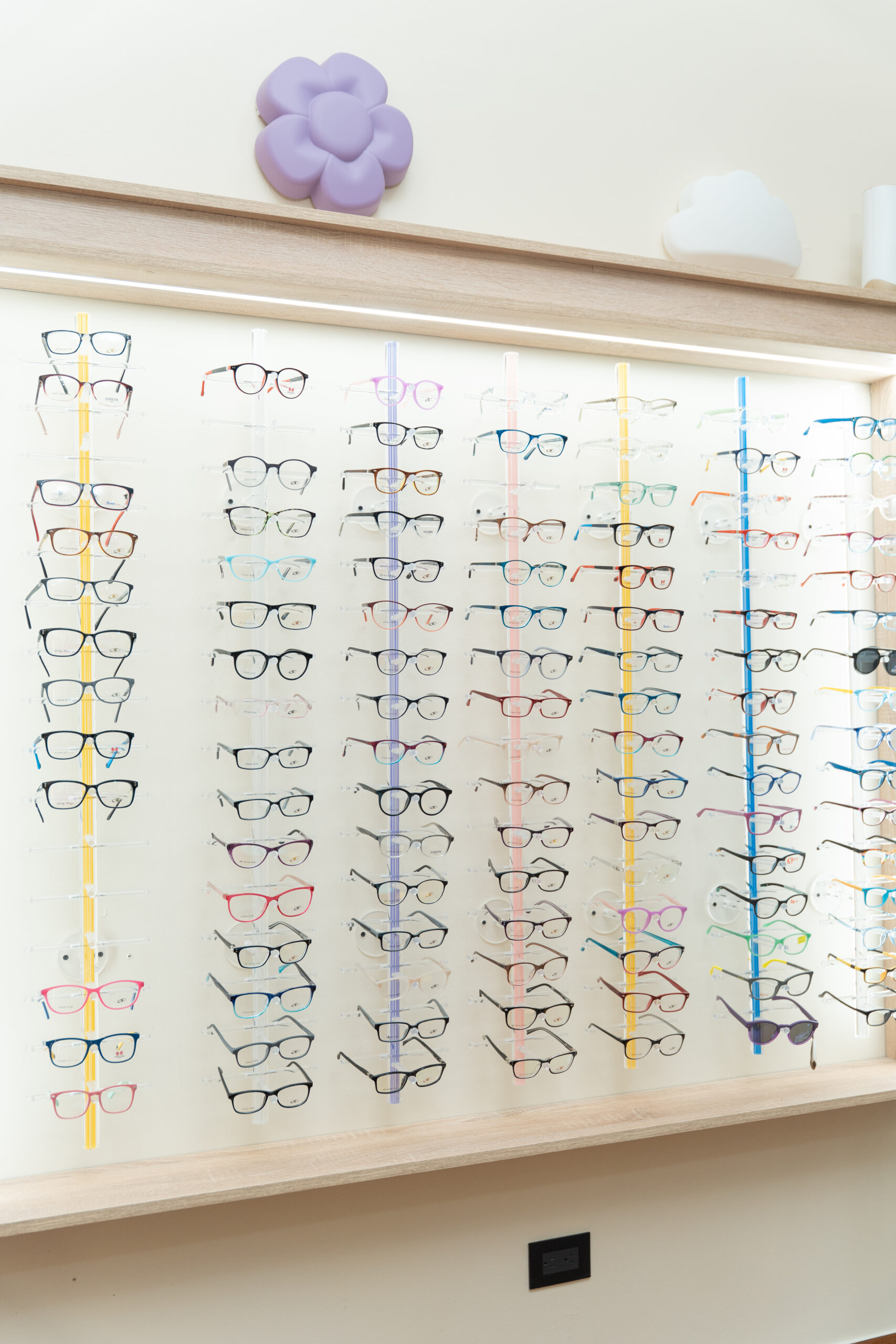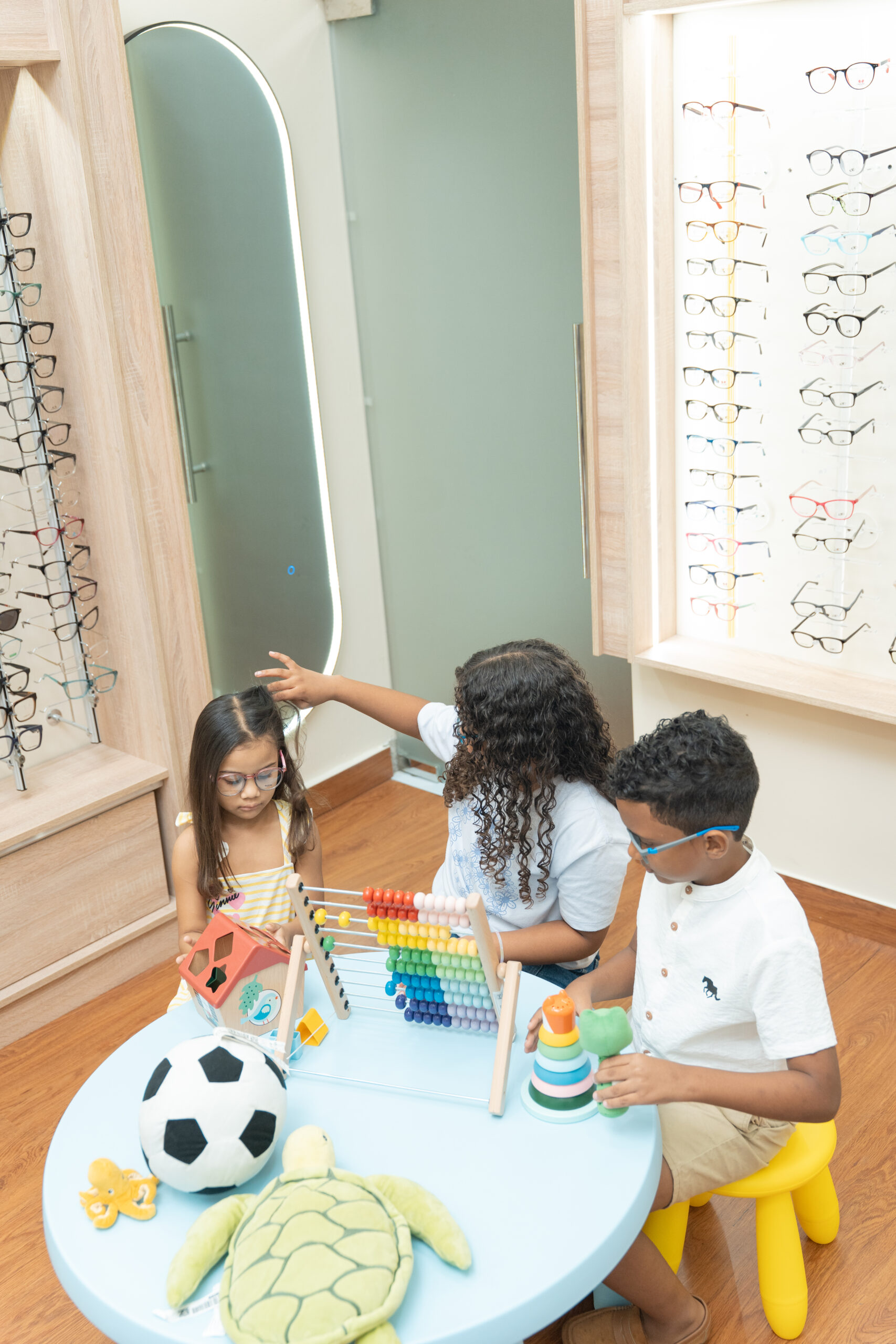 Es un espacio dedicado al cuidado visual infantil, con lentes y accesorios coloridos y resistentes.