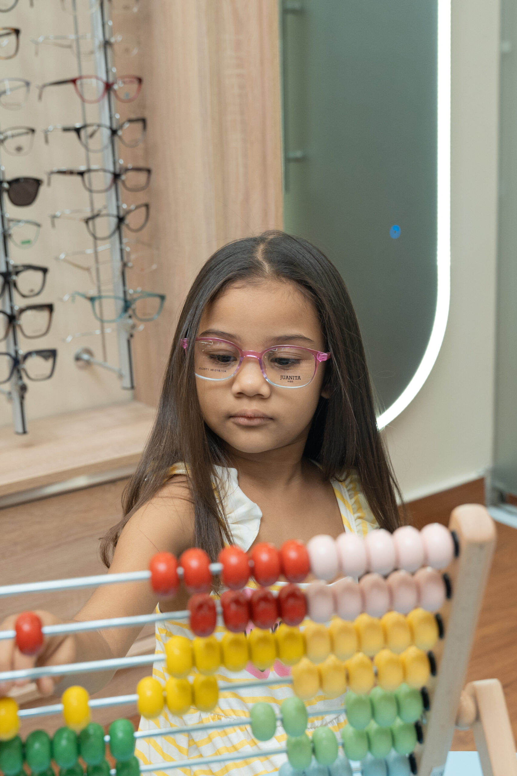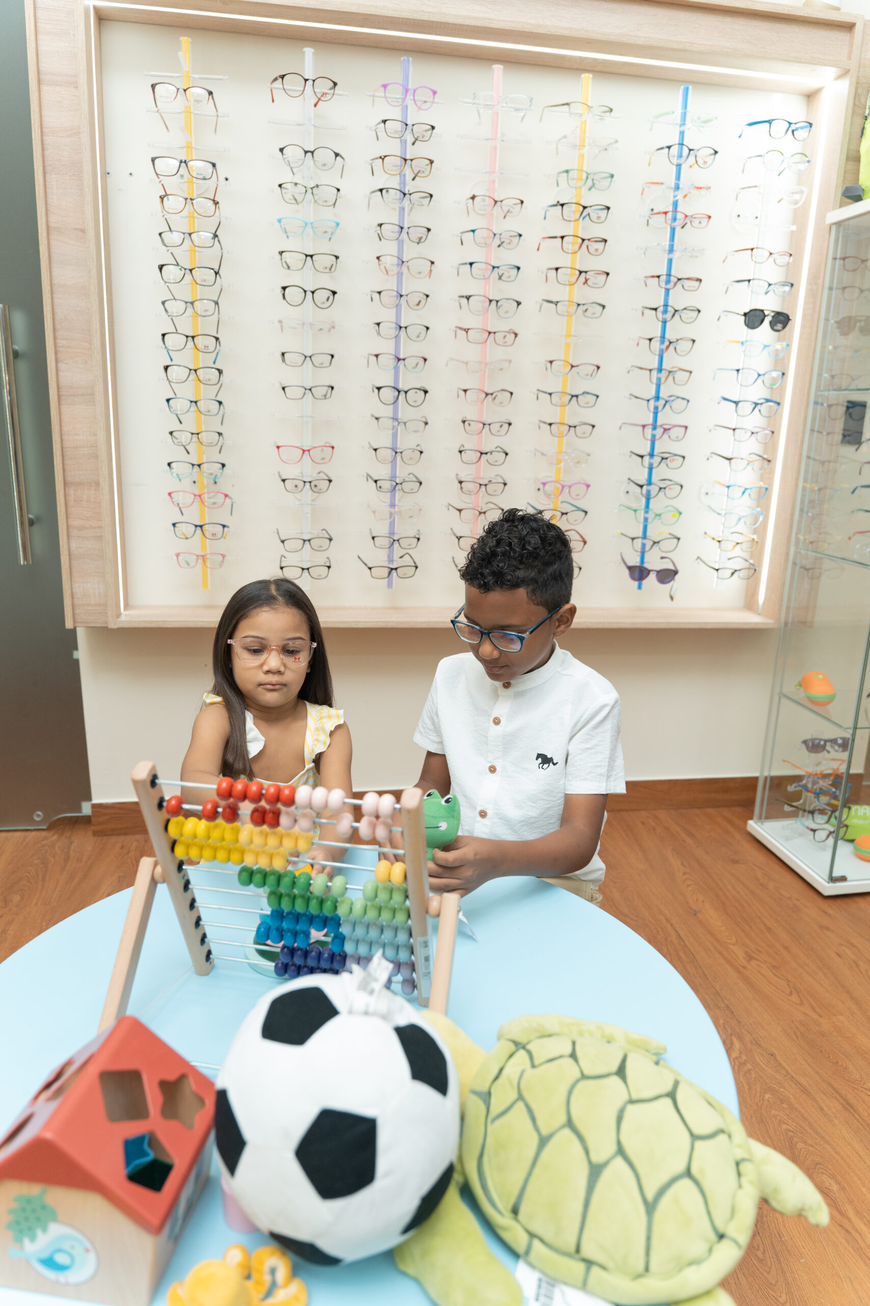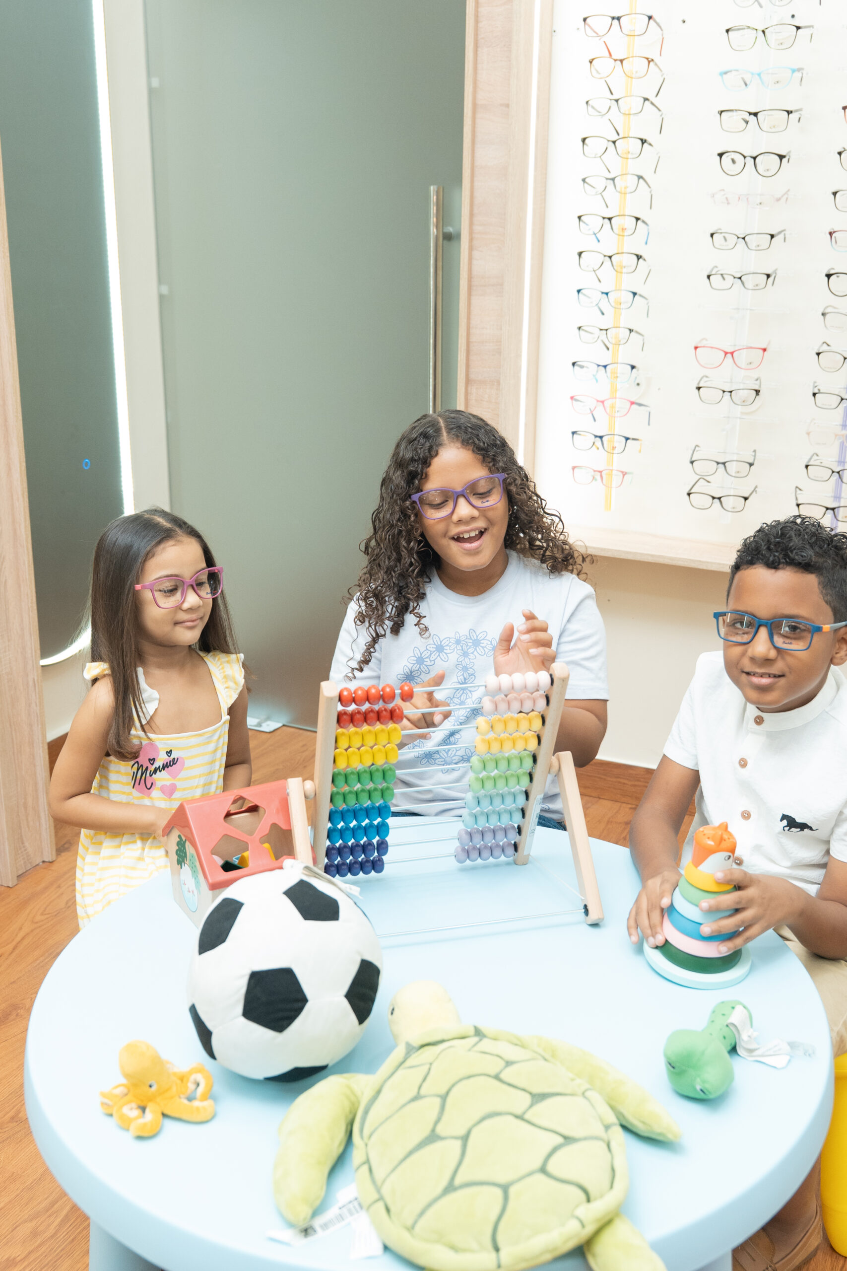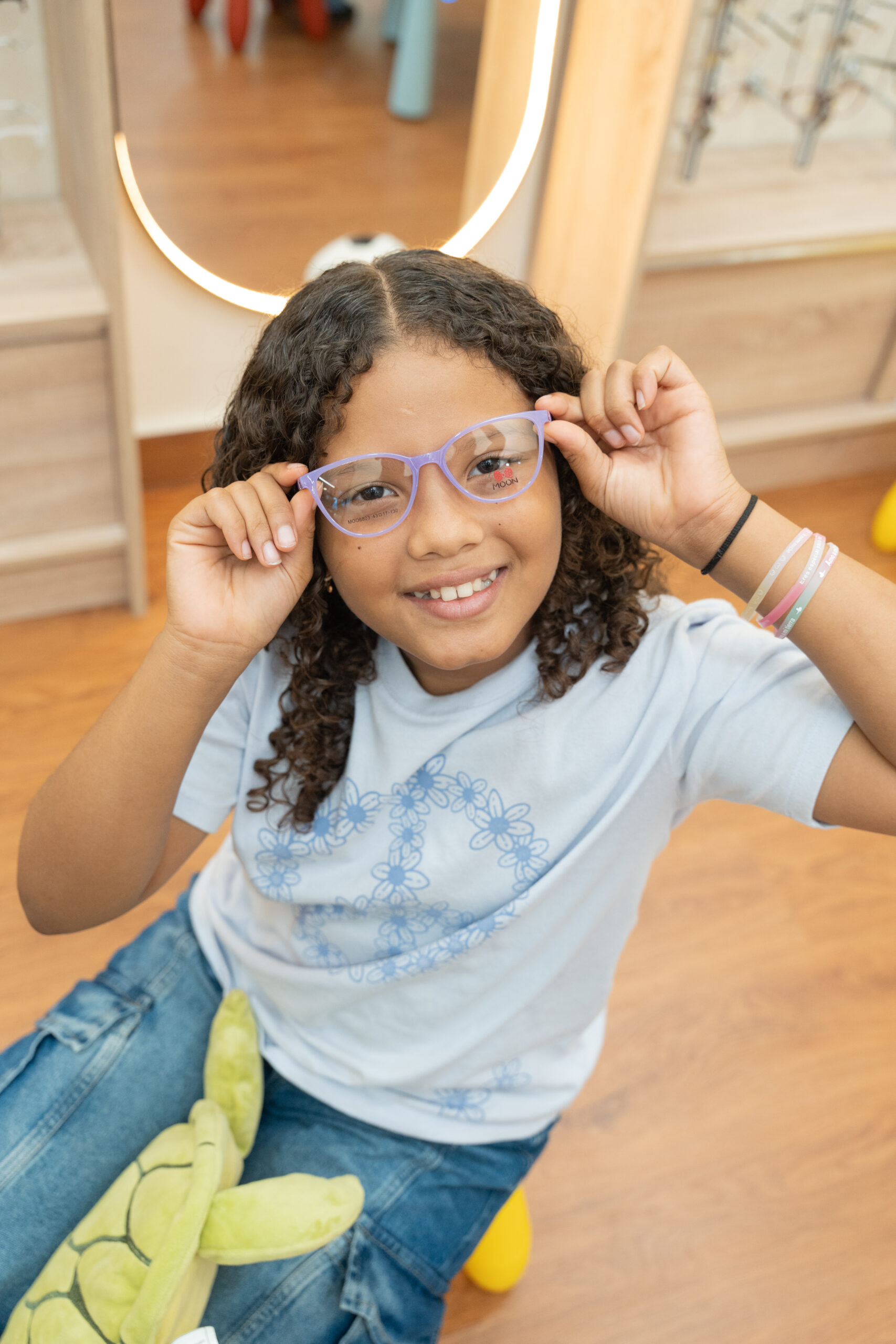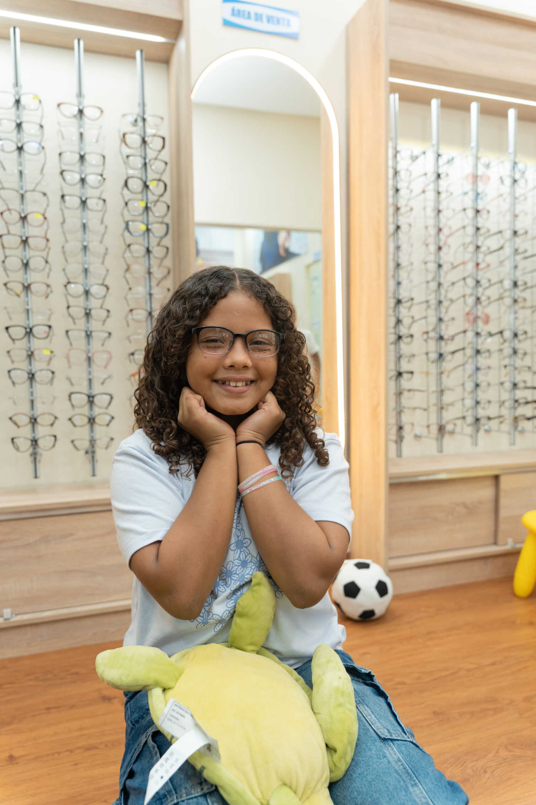 Es un espacio dedicado al cuidado visual infantil, con lentes y accesorios coloridos y resistentes.