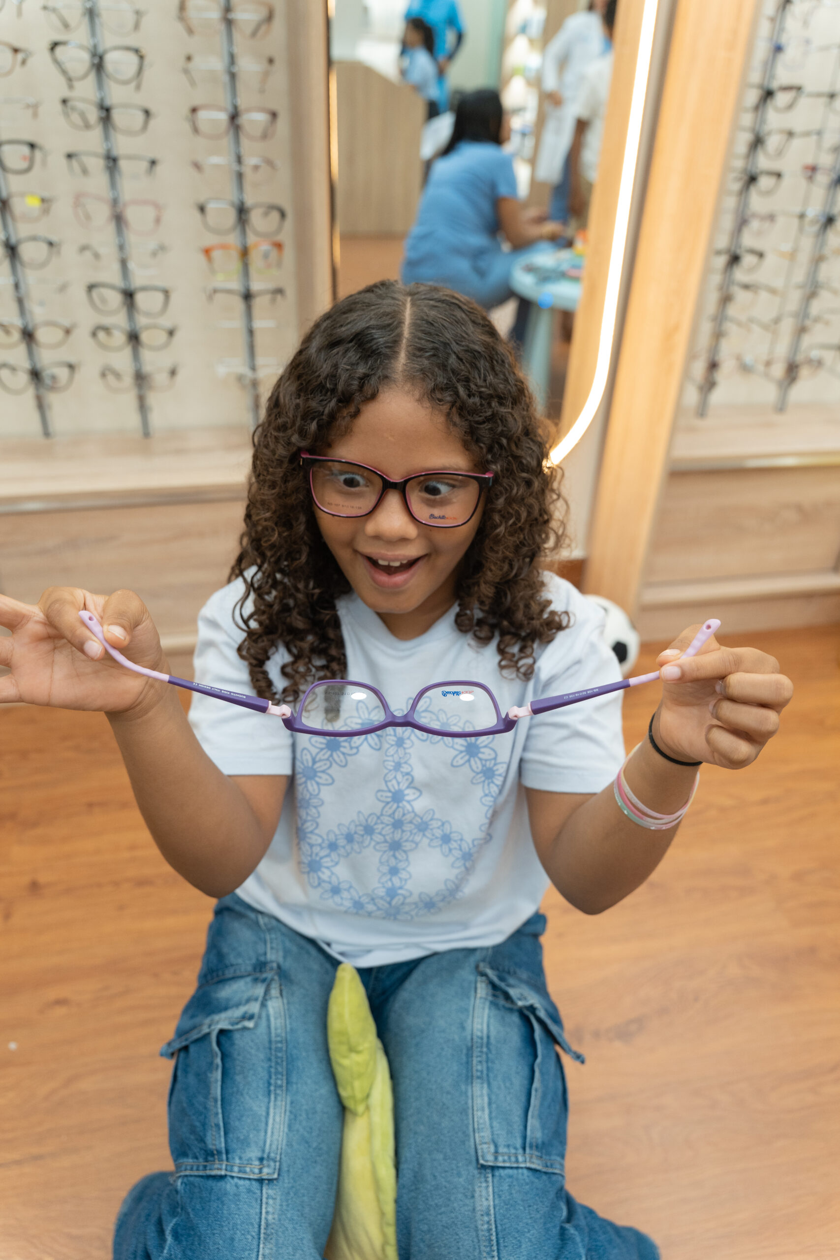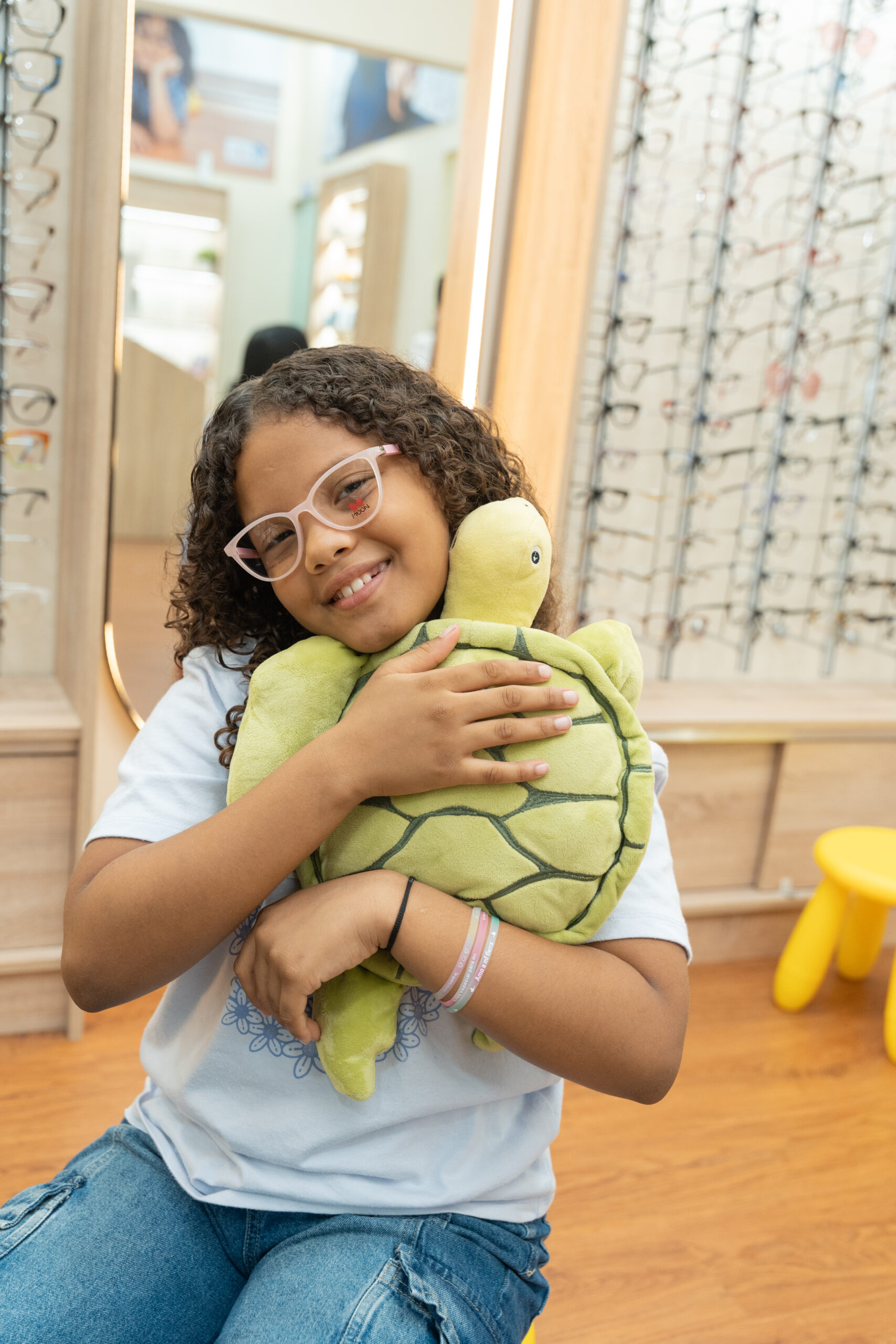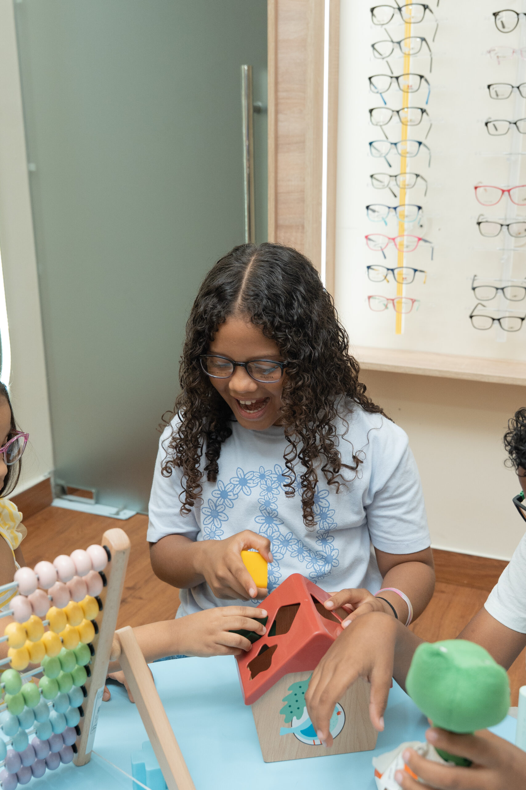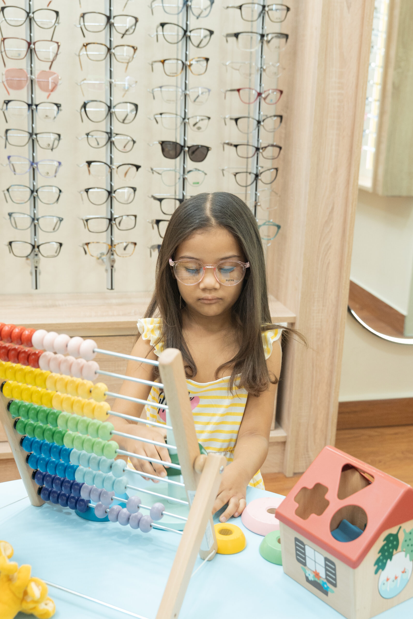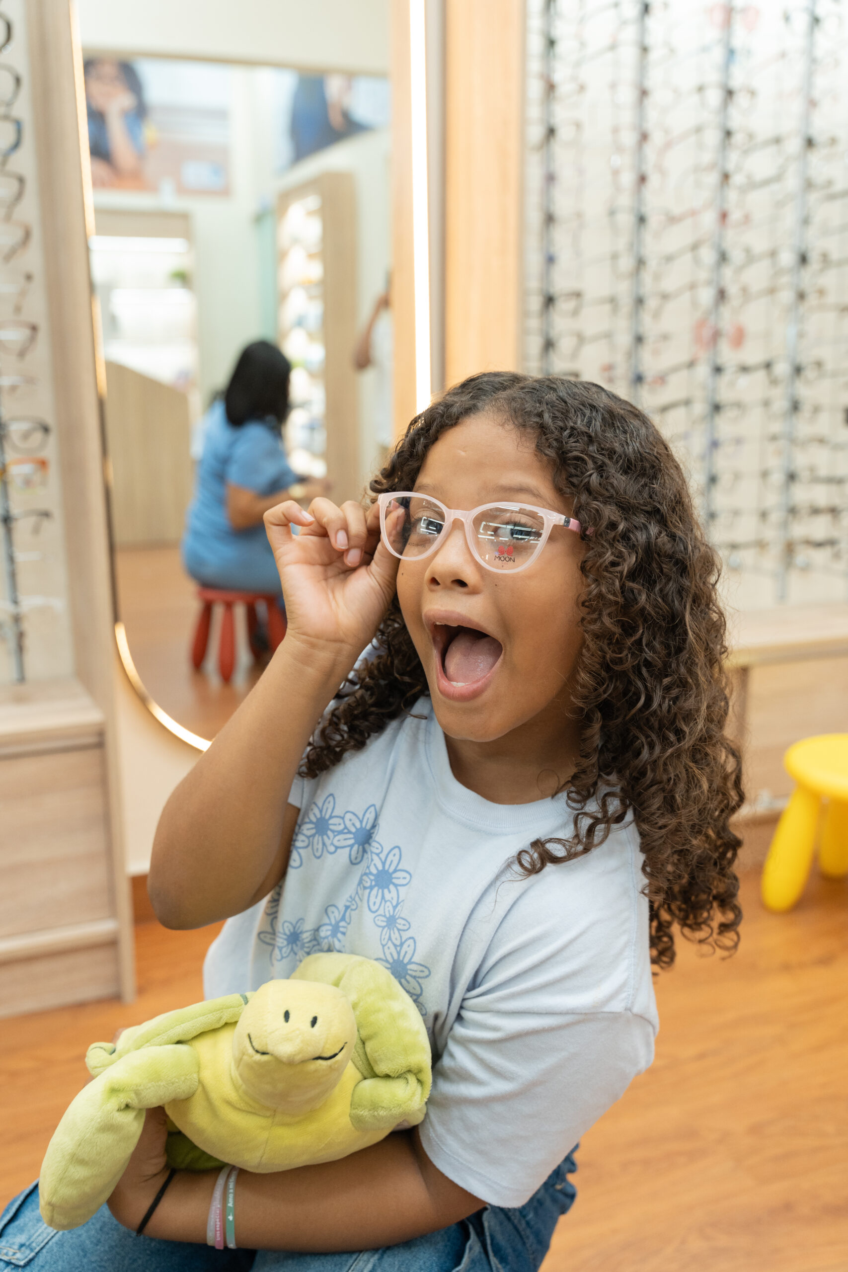 Es un espacio dedicado al cuidado visual infantil, con lentes y accesorios coloridos y resistentes.