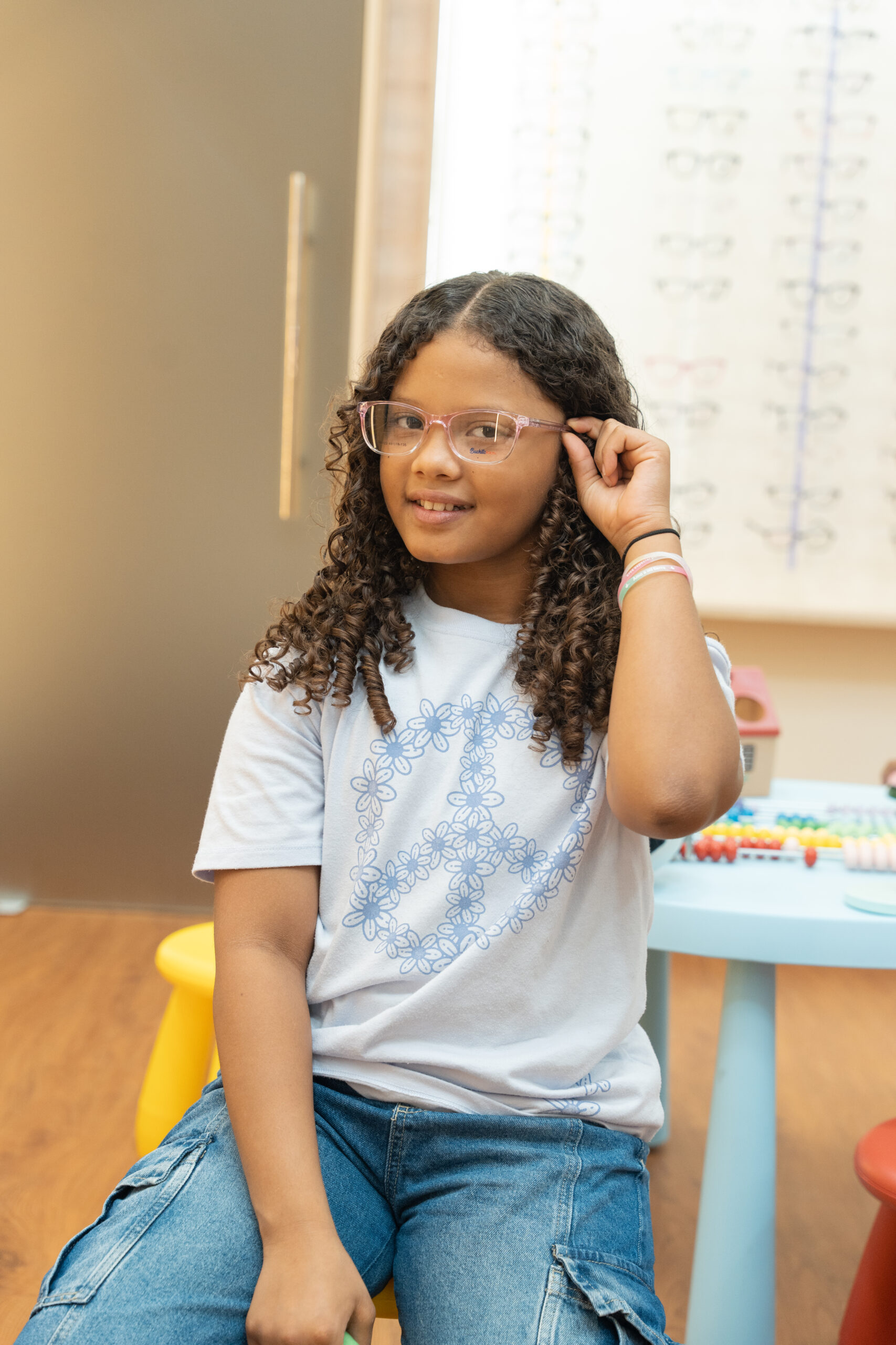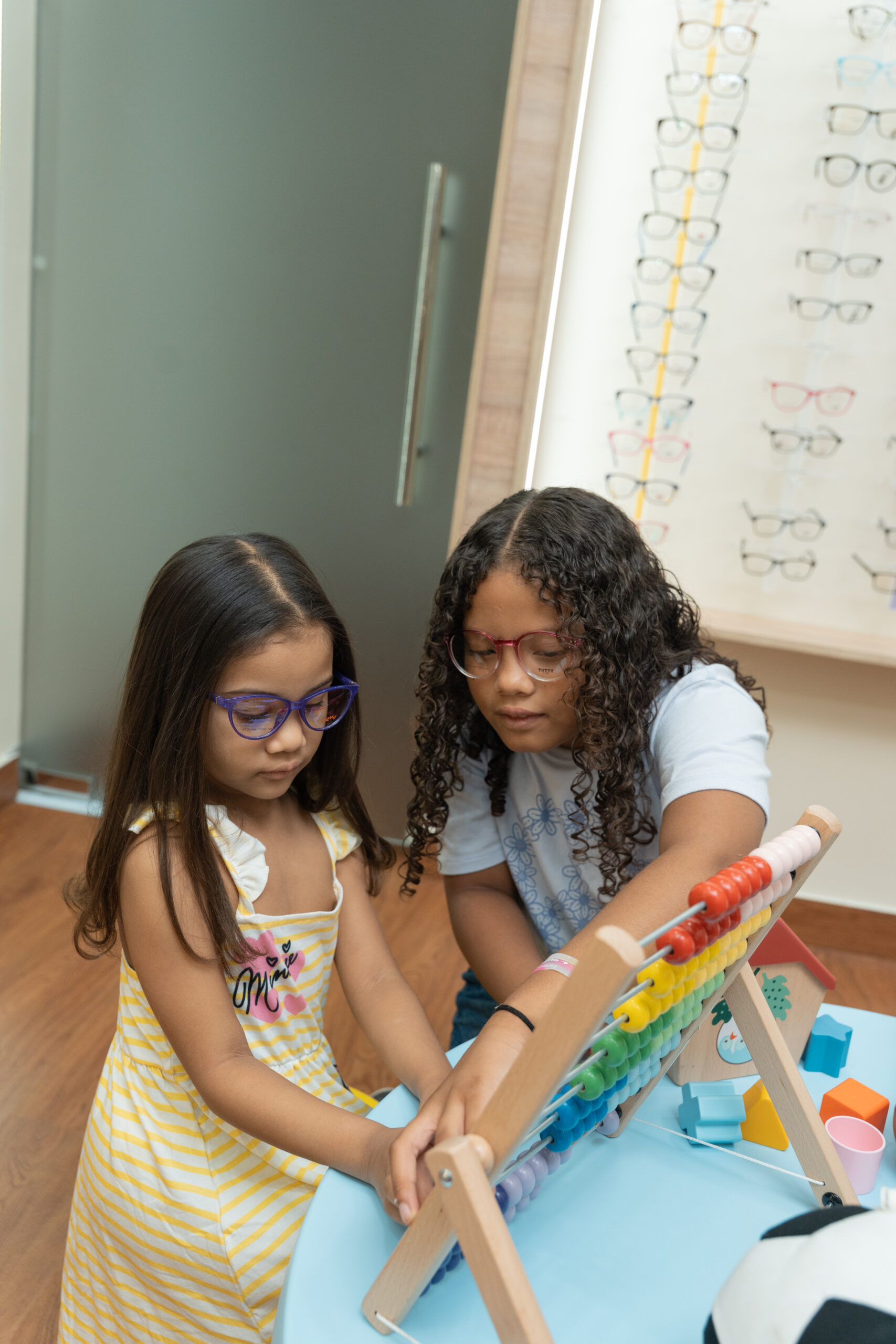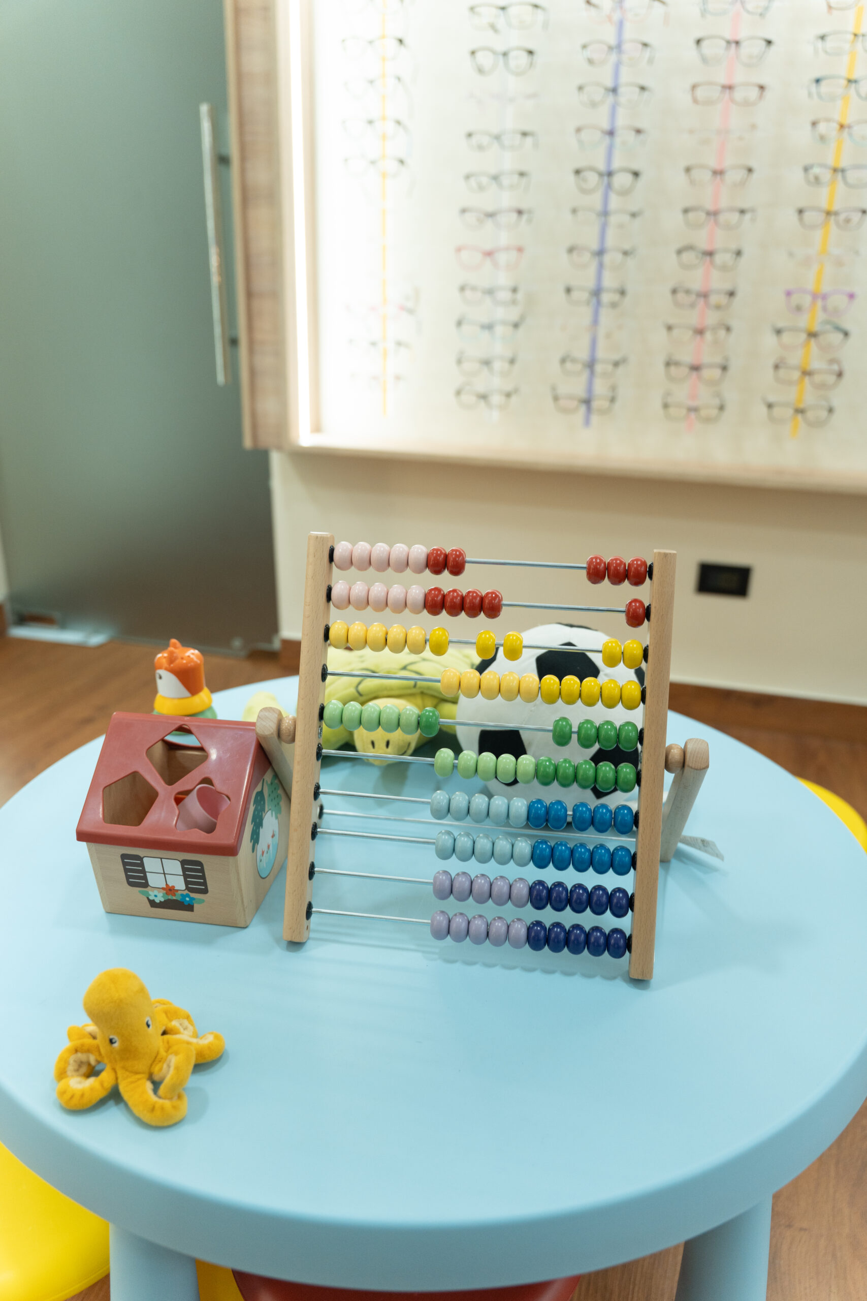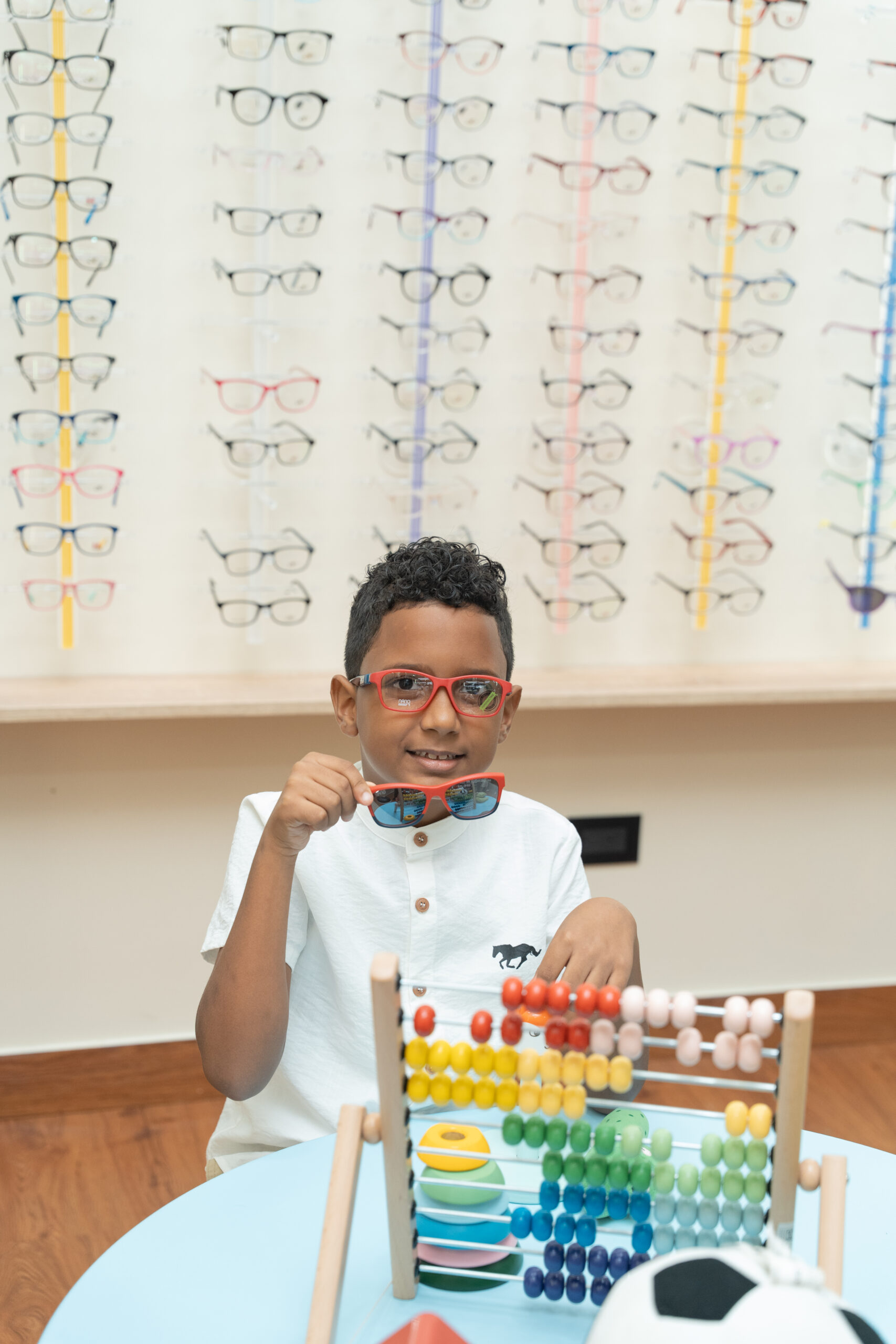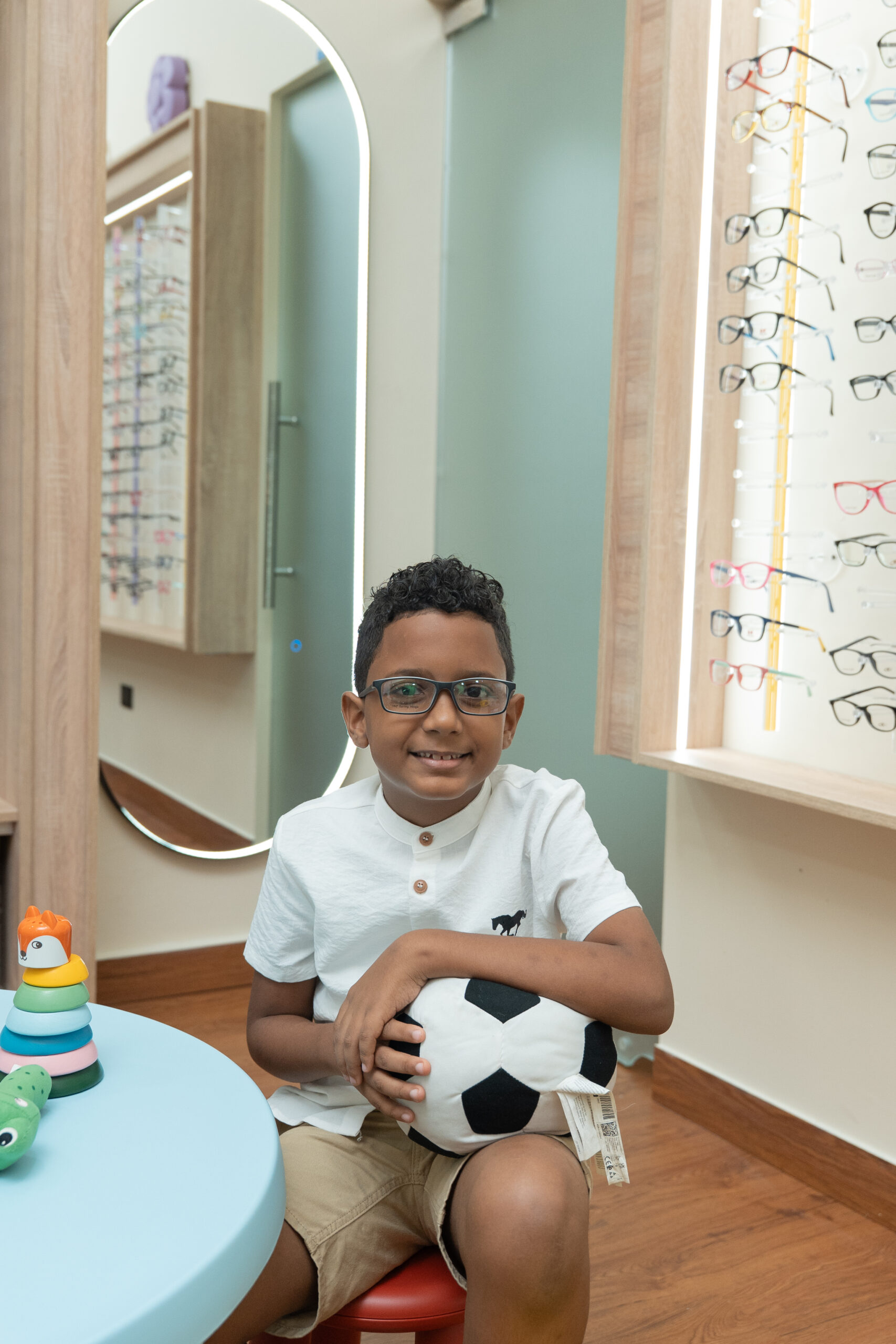 Es un espacio dedicado al cuidado visual infantil, con lentes y accesorios coloridos y resistentes.