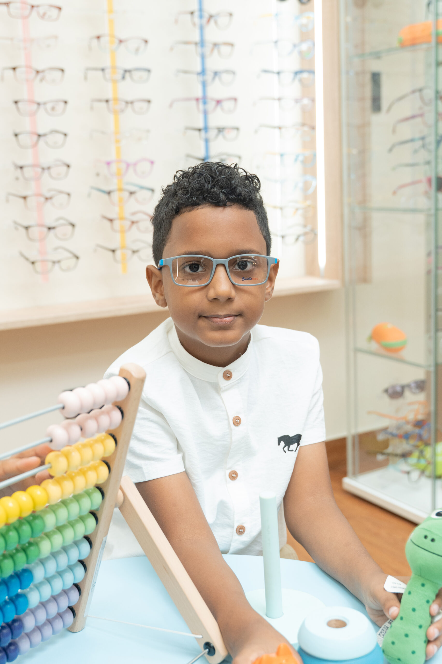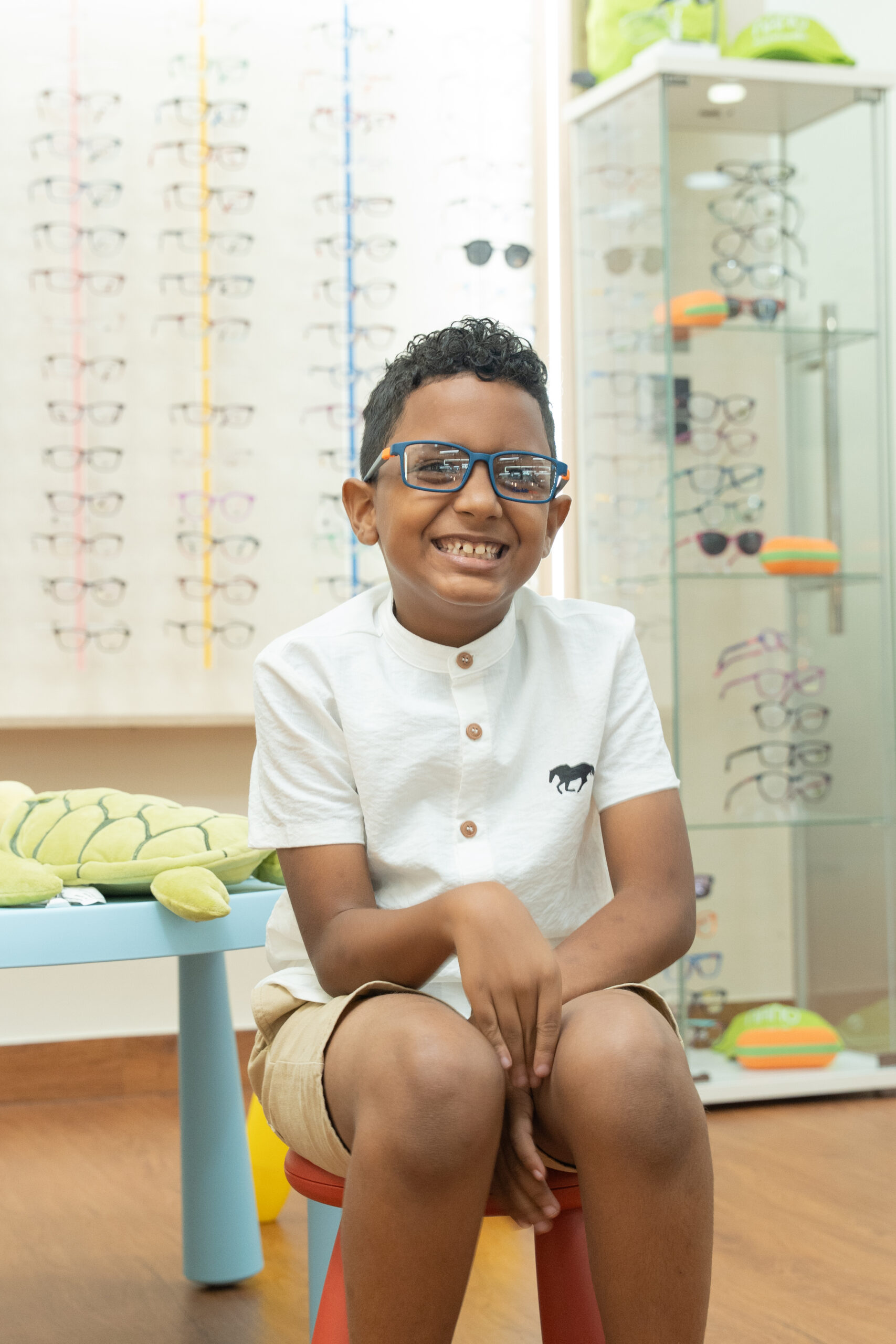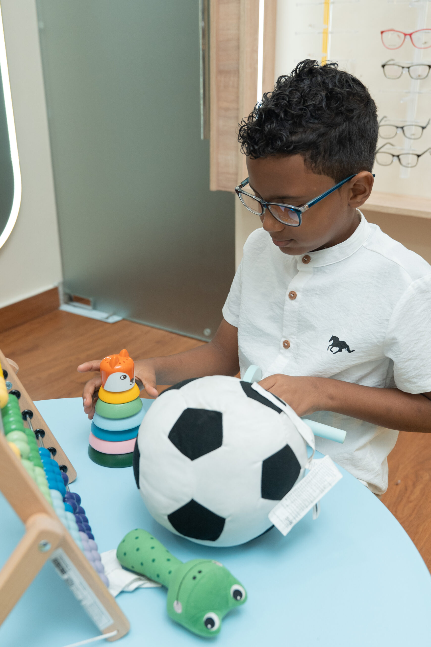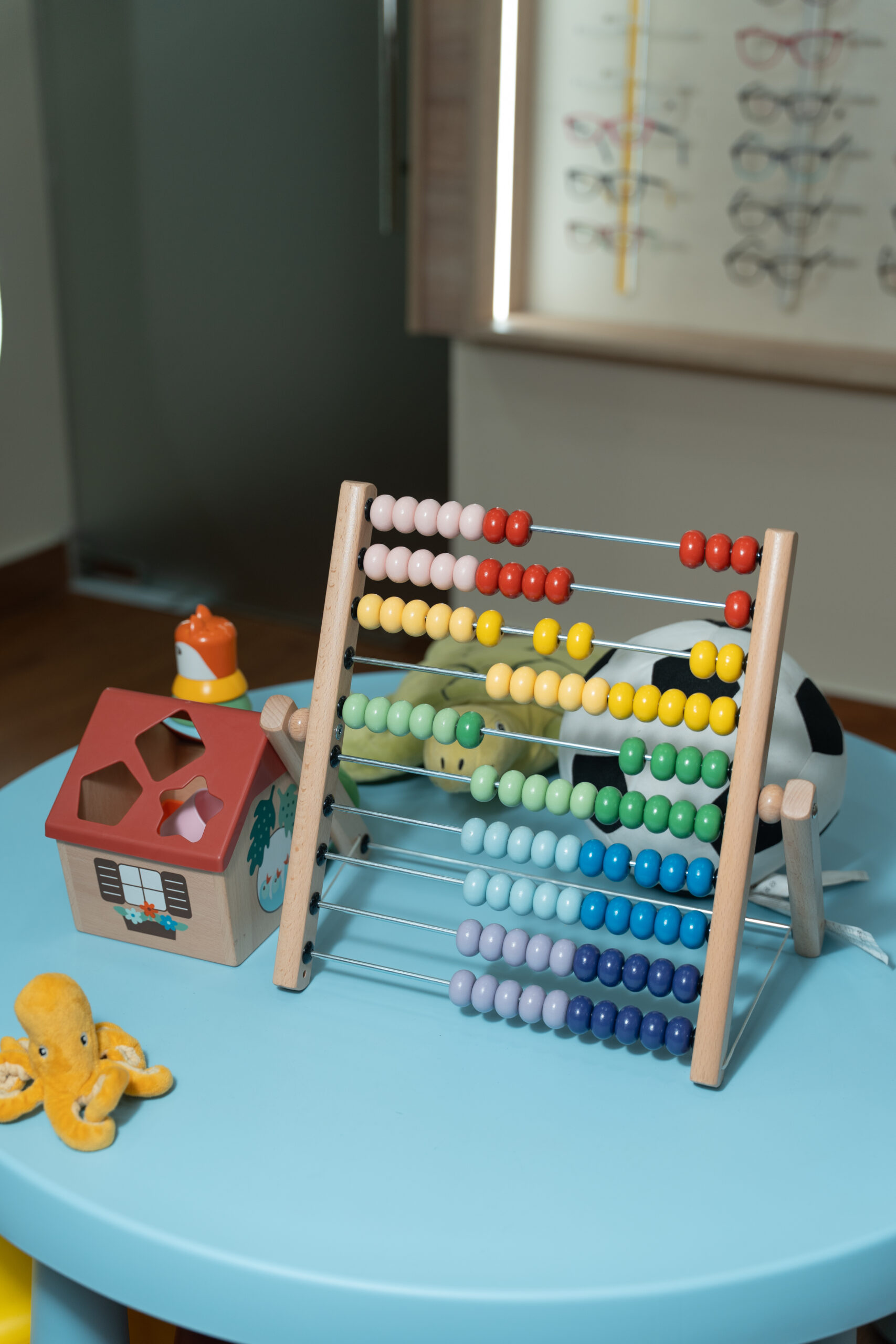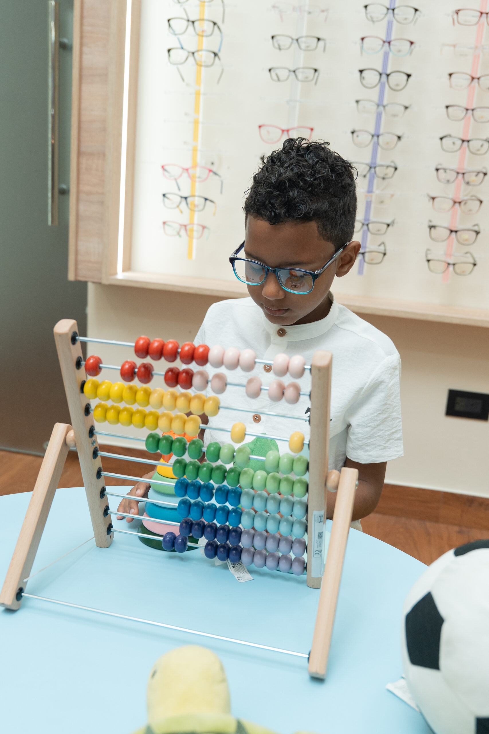 Es un espacio dedicado al cuidado visual infantil, con lentes y accesorios coloridos y resistentes.
