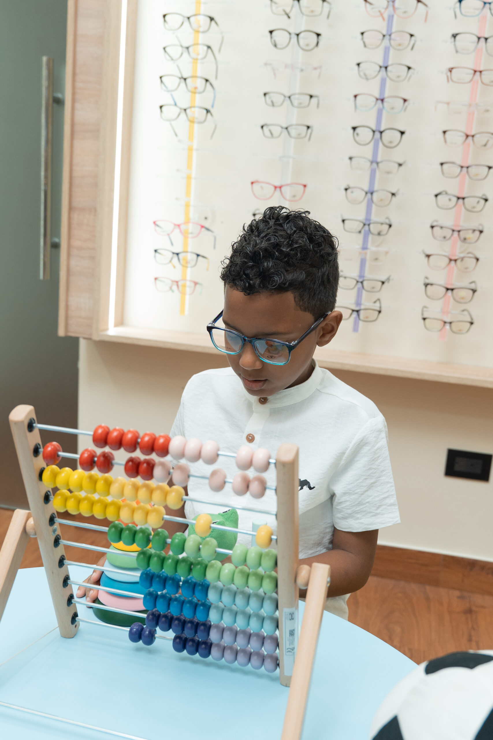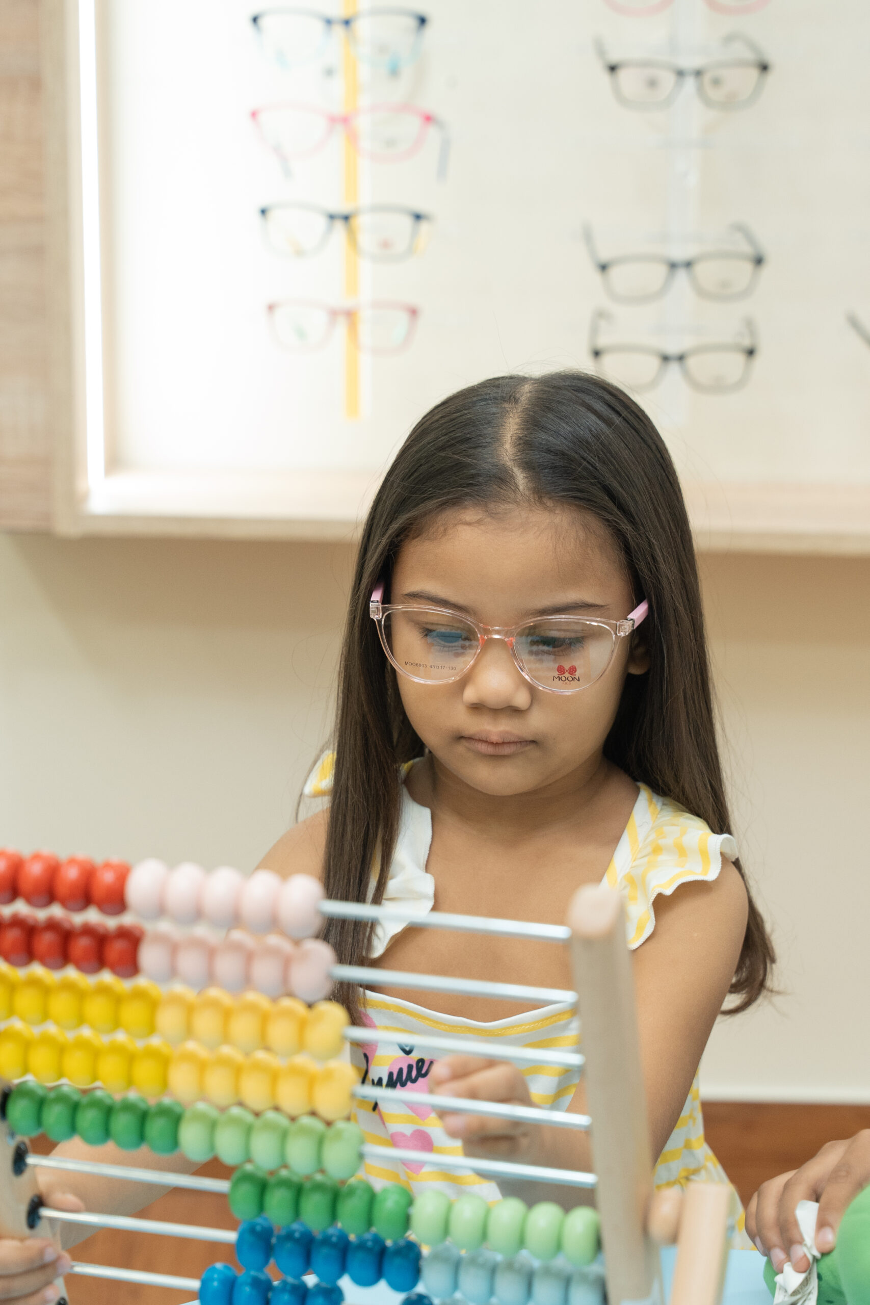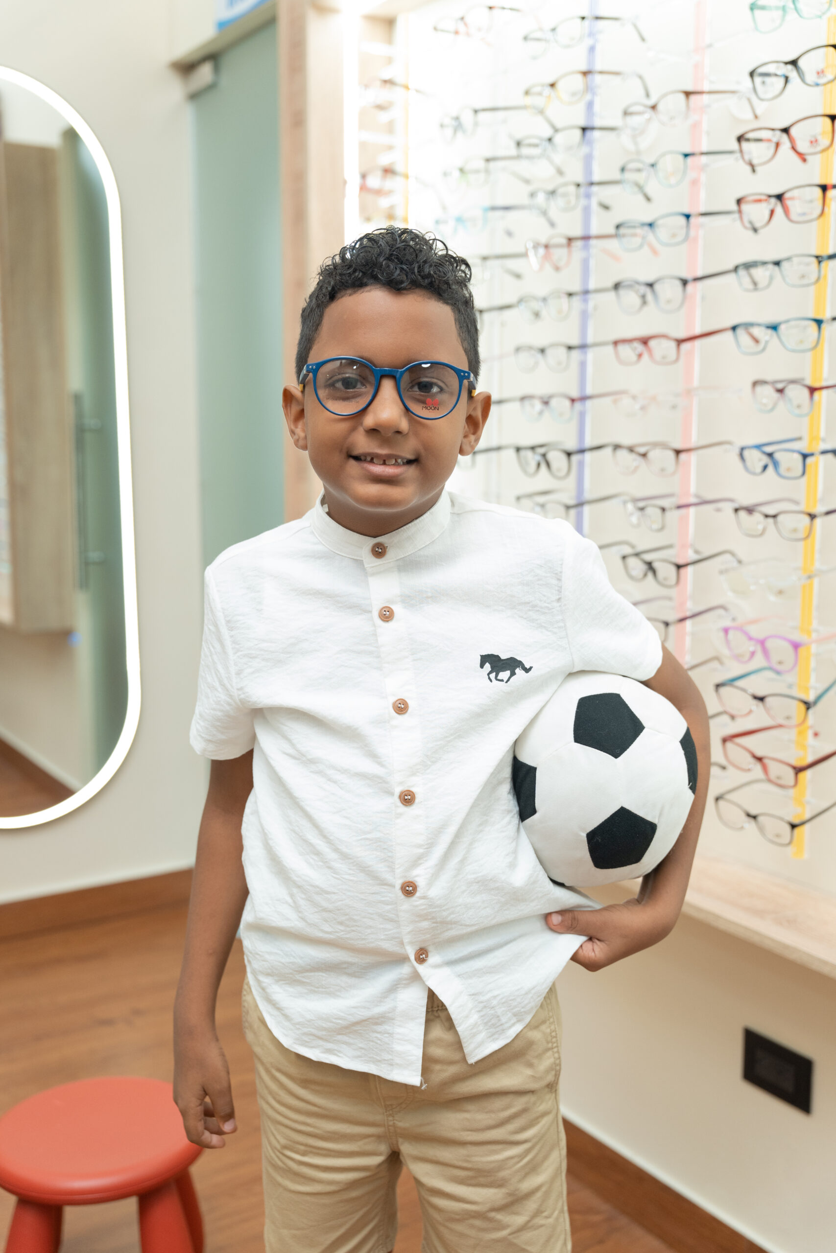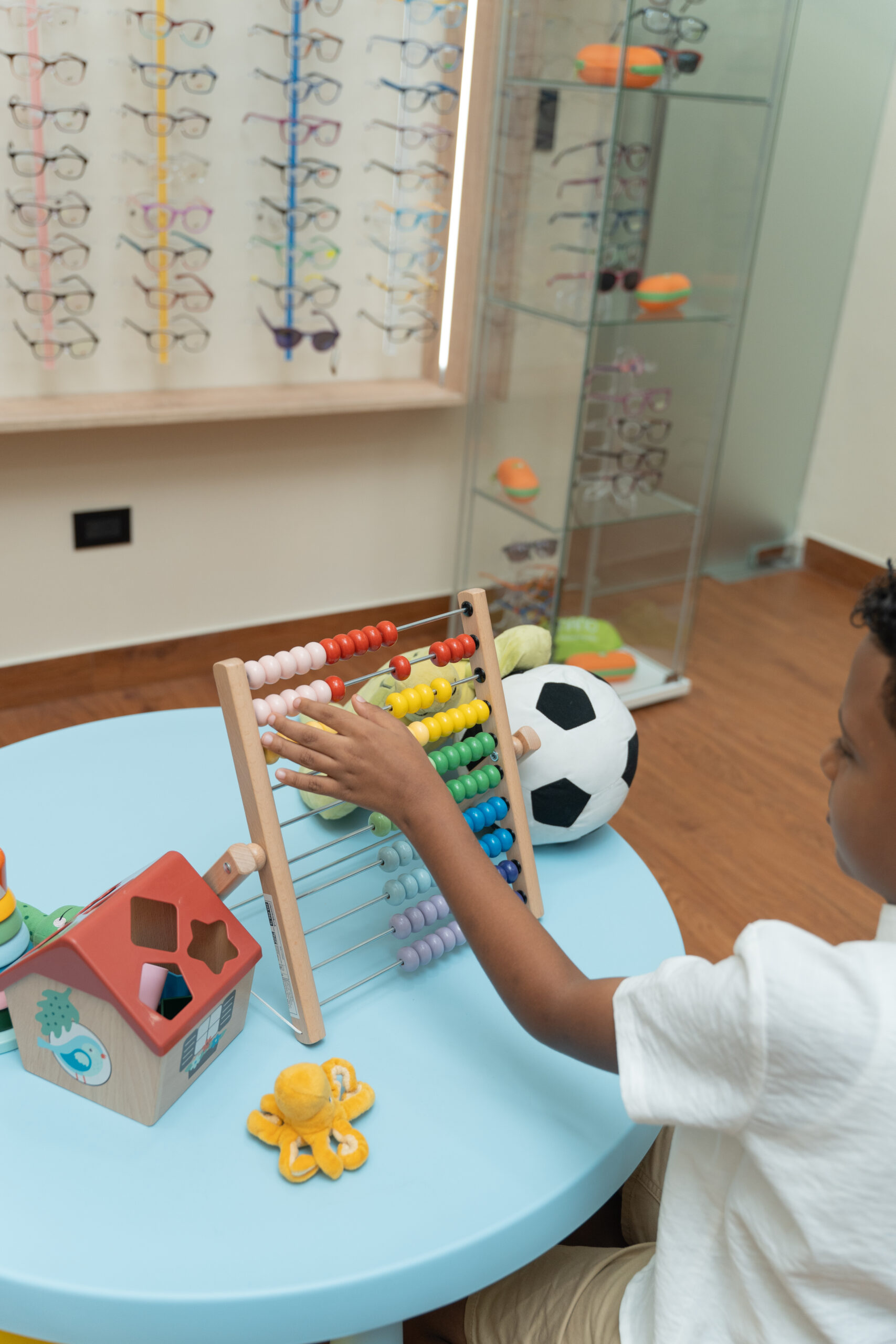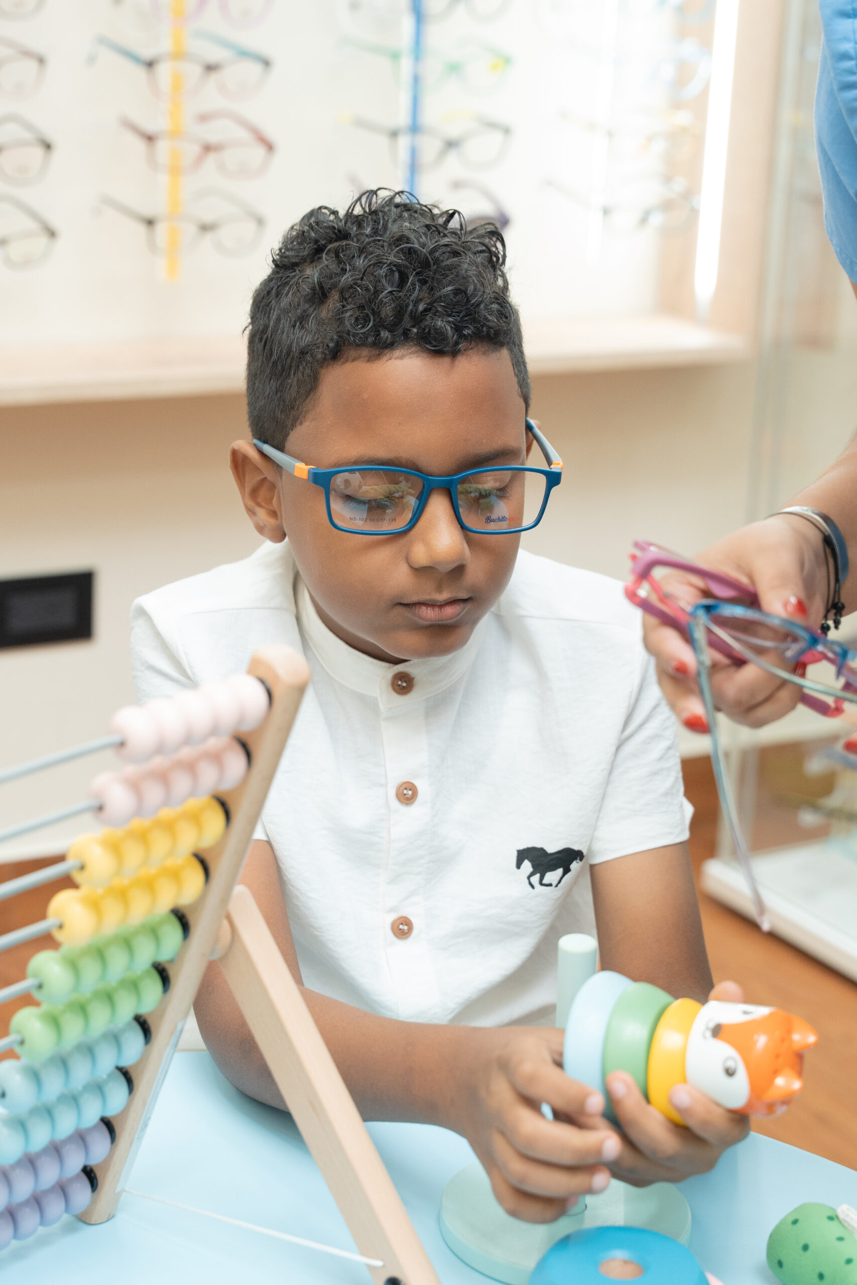 Es un espacio dedicado al cuidado visual infantil, con lentes y accesorios coloridos y resistentes.